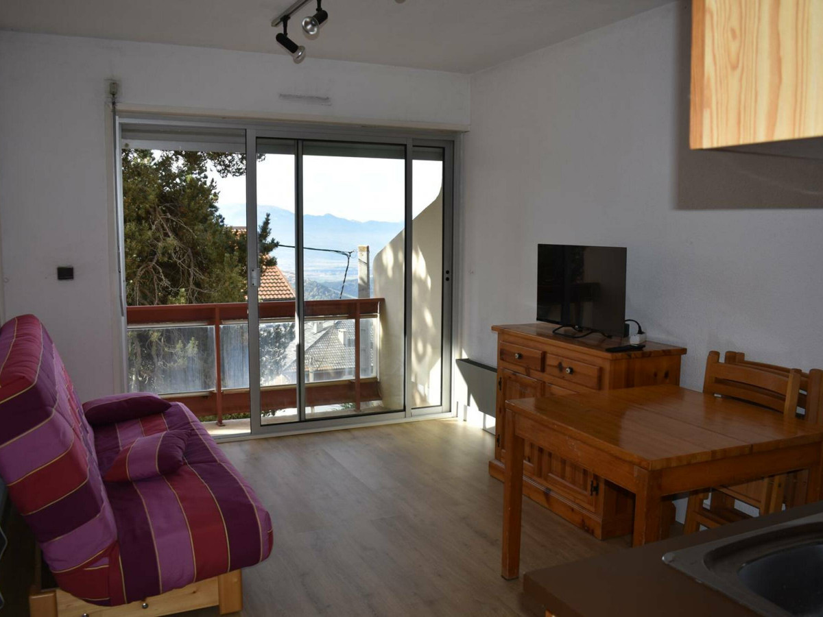 STUDIO CABINE sud au 1er étage d'une petite résidence située à 300 mètres du centre ville, exposition Sud avec vue sur le four solaire et la chaine des Pyrénées. Il est composé : Entrée cabine 2 lits superposés 90, Séjour 1 clic clac 2 personnes, coin cuisine équipé 2 plaques de cuisson électriques, four, micro ondes, réfrigérateur, salle de bains avec WC.