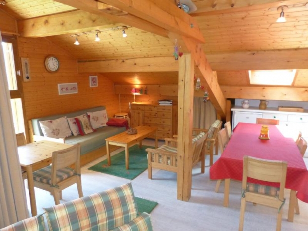 - SEJOUR mansardé (45 m²) : coin repas, coin salon, 1 BANQUETTE-LIT 1 PLACE + 1 LIT GIGOGNE (80), TV écran plat, CHEMINEE, baies + porte-fenêtre sud, balcon sud, vue montagne