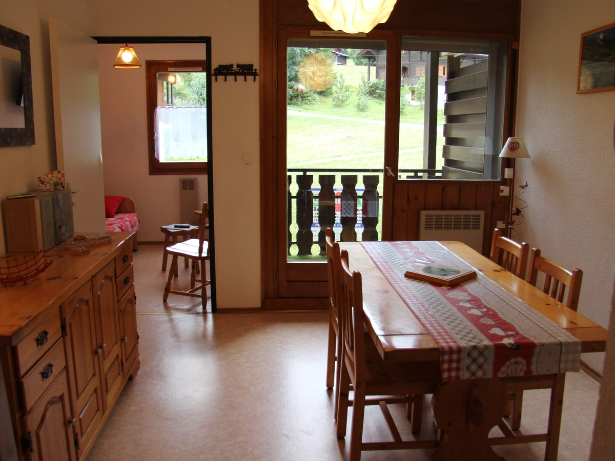 Entrée/Hall (7 m²) : Penderie - Chambrette (4 m²) : 1 lit, fenêtre sud vue champ - Salle de bains : Baignoire, lavabo - wc - Séjour en partie mansardée (16 m²) avec Coin repas : Table et chaises - Coin salon : Canapé, table de salon, télévision, baie vitrée accès balcon ouest (4 m²) vue montagne - Coin cuisine équipée : Four, réfrigérateur (115L), plaques électriques, placards de rangement, lave-vaisselle.