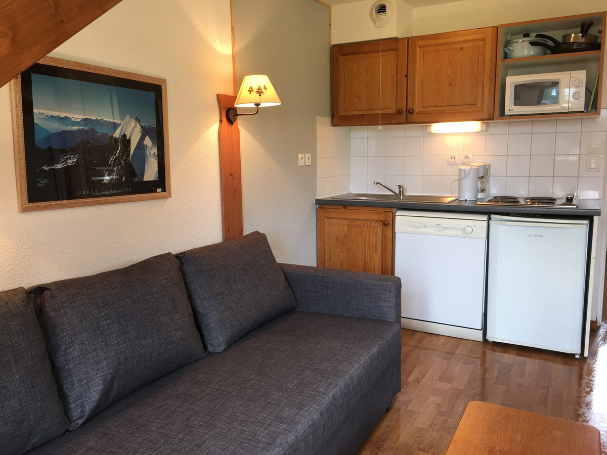 3 pièces 6 personnes. Grand séjour avec cuisine équipée. Lave vaisselle, micro ondes, et four, plaques à induction, cafetière.