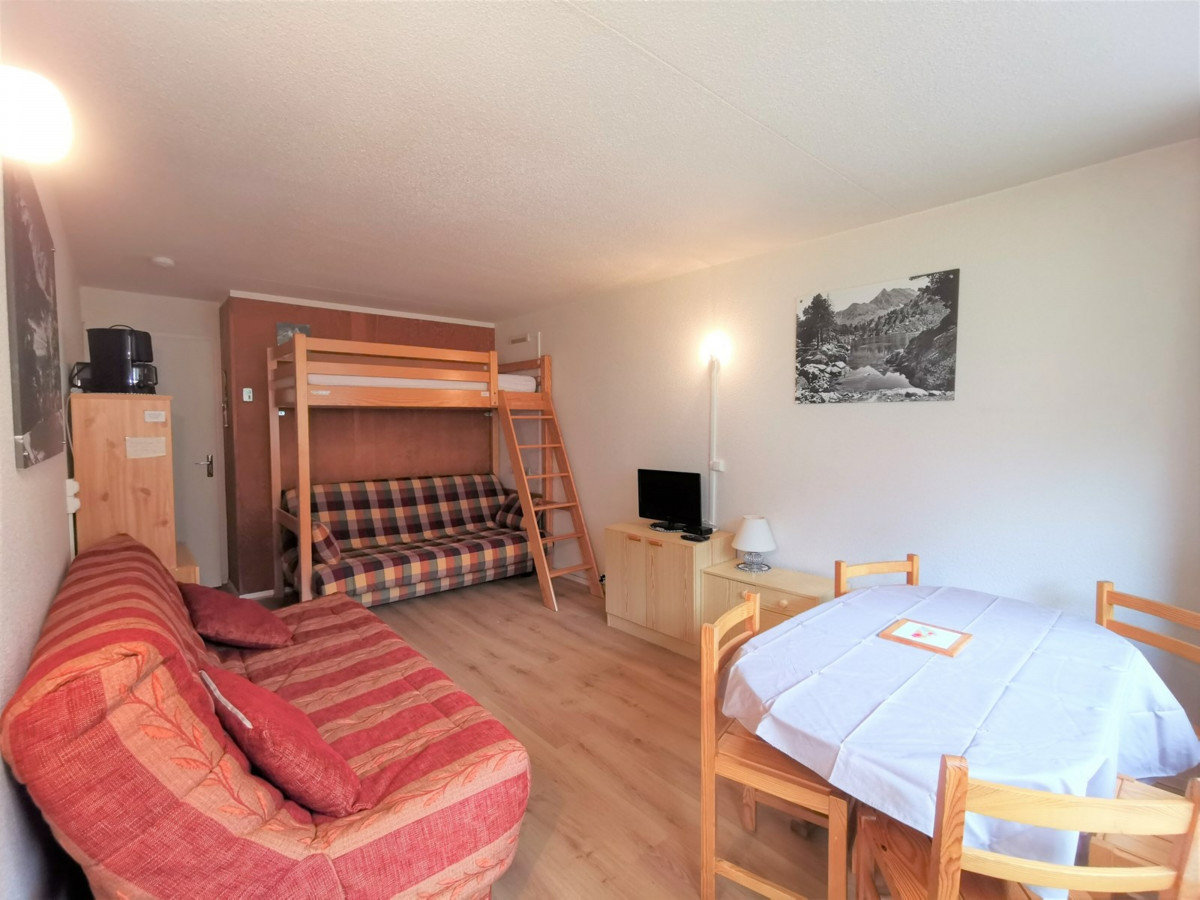 Appartement situé au 4ème étage, surface de 24m² avec balcon, exposition Est (vue vallée). Séjour équipé d?un téléviseur, d?un canapé clic clac pour deux personnes. Coin cabine avec deux lits superposés. Moquette au sol.