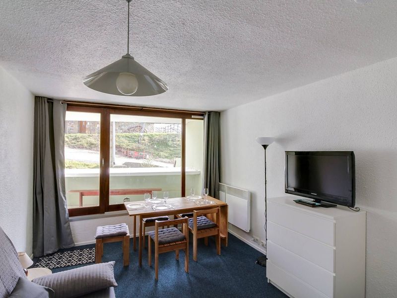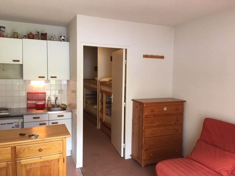 Studio cabine 4 couchages, surface de 28 m² avec terrasse, exposition sud. Séjour équipé d'un canapé lit en 160 (2x80), coin repas, tv. Deux lits superposés en 90 en entrée. Coin cuisine dans séjour avec plaques vitro céramiques, micro-ondes multifonctions, lave-vaisselle, cafetière filtre, bouilloire et grille pain. Salle de bain et toilettes séparées. Sol en lino. Studio non fumeur. Casier à ski en RDC. Emplacement de parking couvert n°111 1er niveau.( hauteur 1.95m).