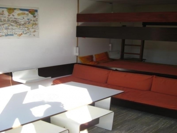 studio lumineux 4 personnes au 2 ème étage en exposition village plein sud, vue pistes sans balcon, 30 m² d'une résidence en centre de station. Séjour avec canapé lit et lits superposés, salle de bains avec toilettes, coin cuisine dans séjour.