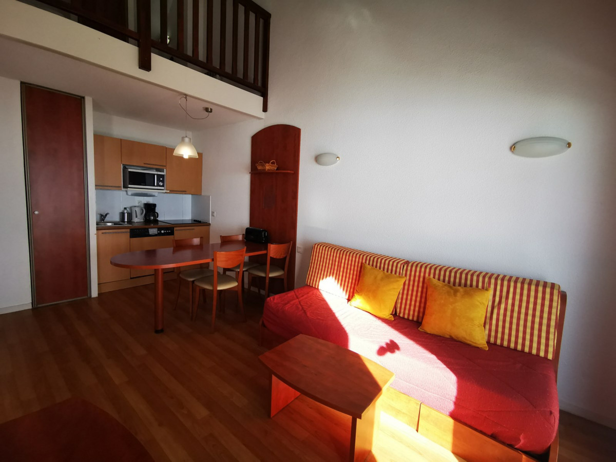Studio situé au 4ème étage, surface de 26m² avec balcon, exposition sud, face aux montagnes. Séjour équipé d?un téléviseur, de deux canapés lit 2 places, parquet au sol. Kitchenette et salle d?eau parquet et pvc.