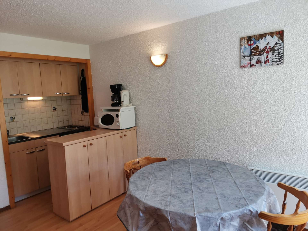 Cuisine ouverte sur séjour, avec plaques électriques deux feux, micro-ondes, mini-four électrique, frigo 110 litres, grille pain et cafetière à filtre. Salle de bain avec toilettes. Casier à skis.