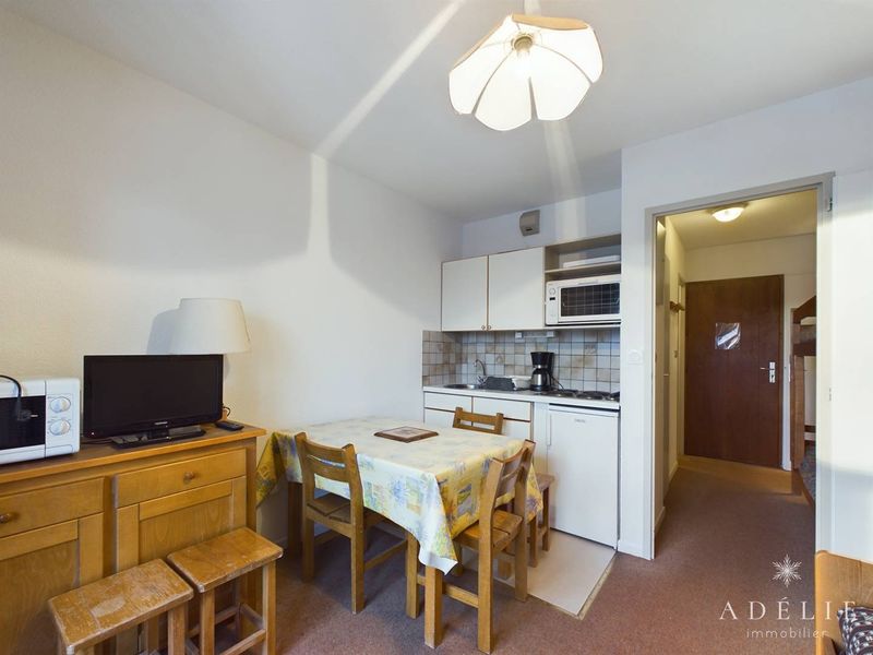 Studio de 23m², 3 personnes, avec une cuisine équipée dans l'entrée, salon avec un lit double rabbatable, un lit gigogne 2 pers.,1 lit simple rabbatable, télévision. Une salle de bain avec baignoire et wc.
