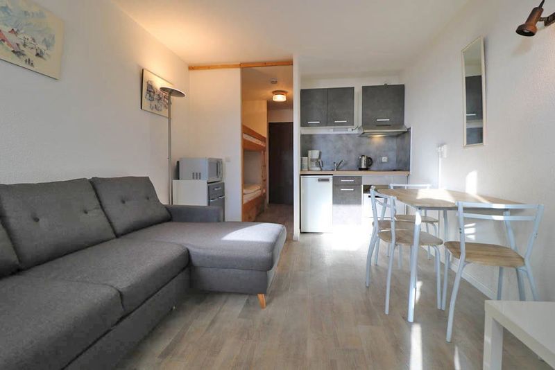 Studio coin montagne de 21m², 3/4 personnes, entrée avec 2 lits superposés, séjour avec 1 canapé lit clic-clac 2 pers. , télévision, kitchenette avec 4 plaques électriques, micro-ondes, four, une salle de bain avec baignoire et wc séparés.