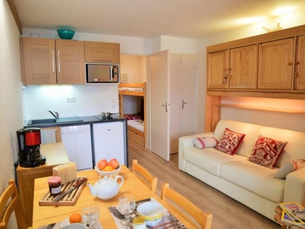 Au sein d'une résidence sécurisée (avec digicode) et à proximité de toutes les commodites ét commerces ainsi que les pistes, chaleureux studio aux tons et décoration harmonieux , soigné et parfaitement fonctionnel dans sa distribution des pièces, présentant: un coin-montagne (séparé du séjour par une porte) avec deux lits-superposés face aux quels vous trouverez une salle d'eau et wc indépendants, un coin-cuisine équipé (pas de lave-vaisselle), et une pièce-à-vivre avec un canapé convertible et accès au balcon.