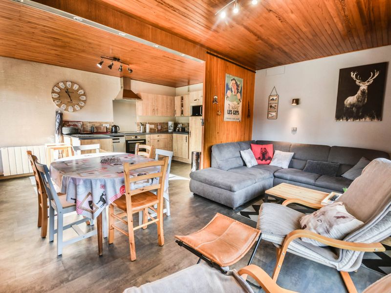 Séjour avec canapé (lit tiroir, uniquement pour dépannage), TV, accès au balcon plein Sud avec vue sur le village et les pistes.