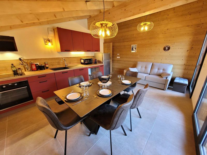 Appartement entièrement rénové situé au 1er étage dans un chalet, au centre station et au calme. Vue sur une partie du domaine skiable. Exposition Sud Est. Capacité : 6 personnes.