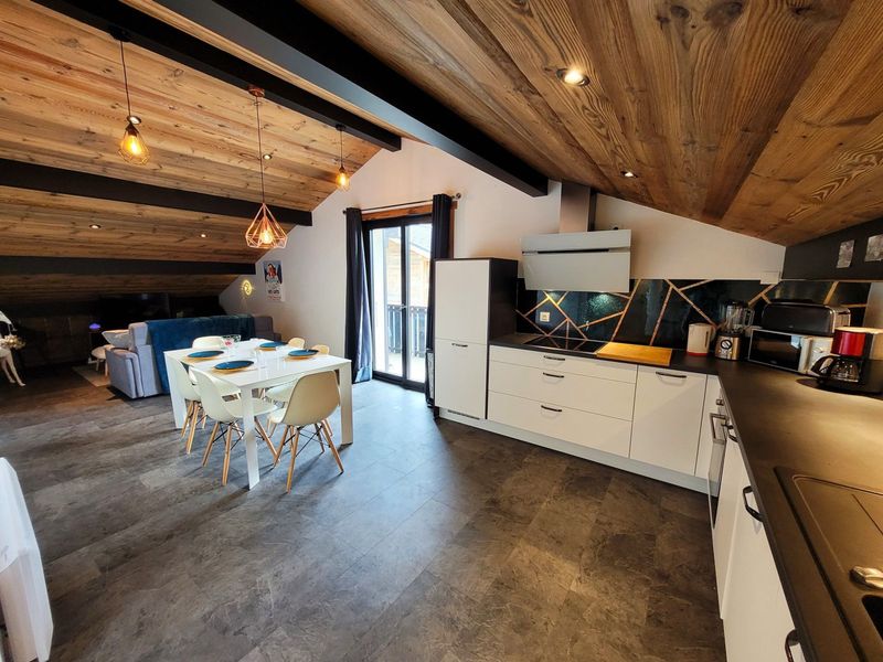 Description : - Hall d'entrée avec placard de rangement - Coin cuisine entièrement équipé (plaques vitrocéramique et four électriques, réfrigérateur, lave-vaisselle, bouilloire, grille-pain, cafetière électrique, cafetière à dosette NESPRESSO, hotte aspirante, placards de rangement haut et bas avec batterie de cuisine, le coin cuisine est séparé du séjour par un meuble bar - Séjour salle à manger équipé + accès sur la terrasse par grande baie vitrée avec mobilier de jardin, vue sur l'arrivée des pistes et ESF - Un petit salon avec hauteur mansardée inférieur à 1.80M (une partie du salon) équipé d' 1 Clic-clac 2 personnes (140) et d'1 téléviseur avec bouquet divertissement, canal + et beeing sports - Une chambre familiale spacieuse équipée d' 1 lit 2 personnes (140) + 2 lits superposés 1 personne (90) - Une chambre équipée d' 1 lit 2 personnes (140) avec rangement + accès à un petit balcon - Salle de bains (baignoire, lavabo, lave-linge) hauteur inférieur à 1.80m - WC indépendant.