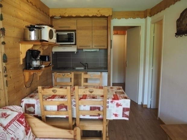 Studio avec cabine, entièrement rénové en style montagnard, il fait 22 m² pour 4 personnes. Il est situé au 4ème étage et possède un balcon orienté Ouest.