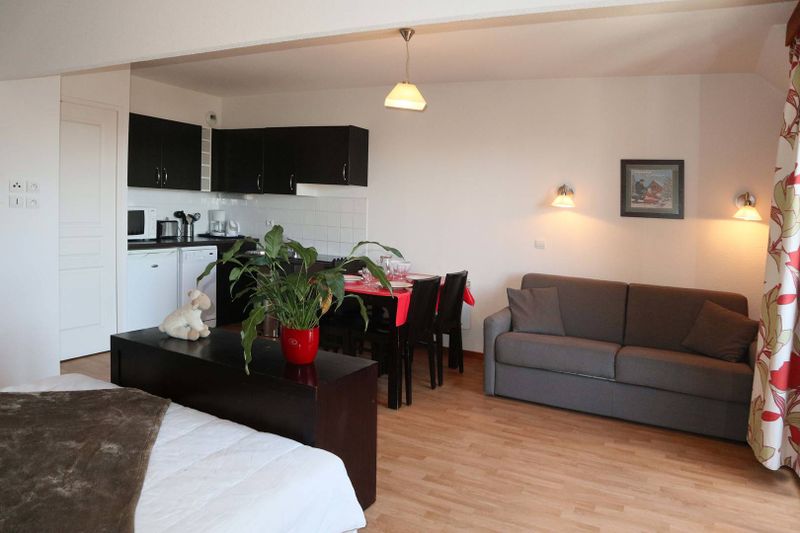 Studio équipé pour 4 personnes au 7ème étage avec ascenseur, comprenant une entrée avec 2 lits superposés 1 place, un séjour avec 1 banquette convertible 2 places, un coin cuisine ouvert sur le séjour, un salle de bains et wc indépendants. Balcon offrant une très belle vue sur la vallée et la patinoire. Accès direct aux pistes, aux commerces et au centre de la station. Carrelage dans tout le logement.