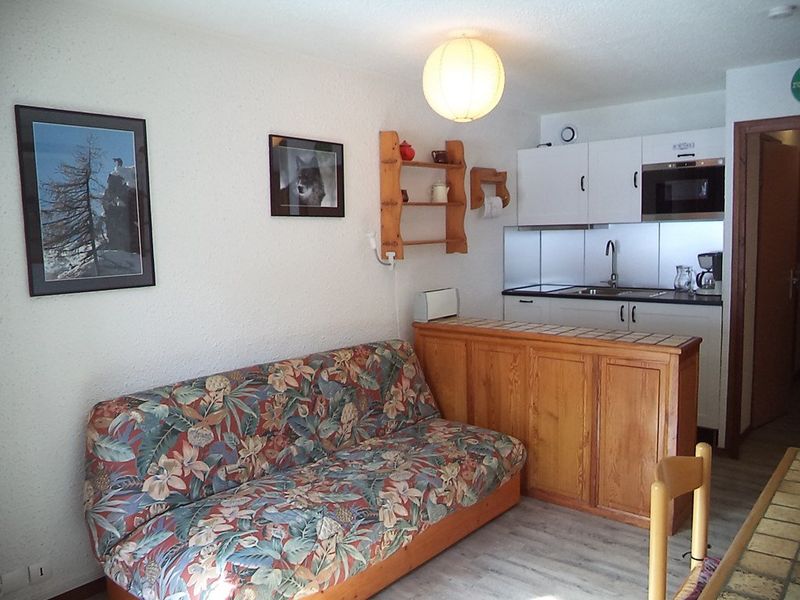 Joli studio aménagé pour 4 personnes, une entrée, un alcôve ouverte sur le séjour avec 2 lits superposés 1 place, un séjour avec 1 banquette convertible 2 places, une salle de bains avec WC indépentent, un coin cuisine. Balcon offrant une très belle vue sur les pistes exposition Sud, lino dans tout le logement.