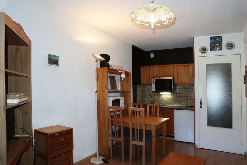 Coquet studio aménagé pour 4 personnes, une entrée, une alcôve ouverte sur le séjour avec 2 lits superposés 1 place, un séjour avec 1 banquette convertible 2 places, une salle d'eau avec wc indépendant, un coin cuisine. Fenêtre offrant une très belle vue sur la vallée exposition Ouest, lino dans tout le logement.