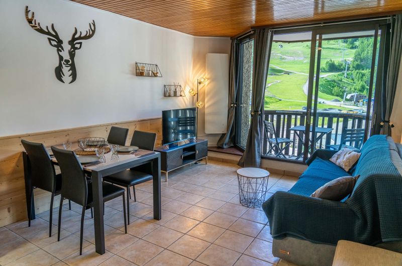 Très joli studio avec prestations de qualité, décoré montagne, équipé pour 4 personnes composé d'une entrée avec 2 lits superposés 1 place d'un séjour avec 1 banquette convertible 2 places, salle de bain avec wc indépendants, coin cuisine ouvert sur le séjour, balcon exposé sud avec vue sur les pistes.