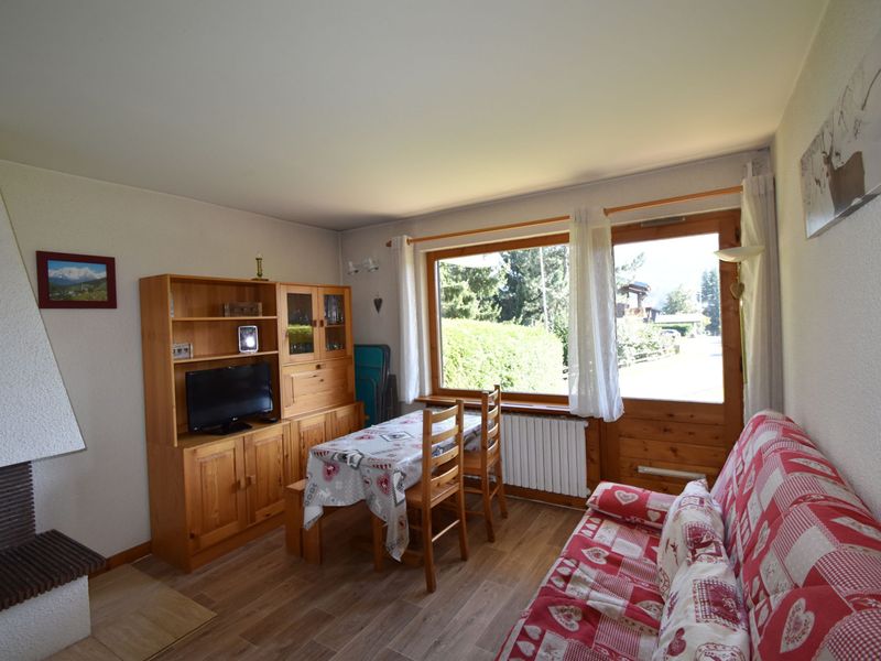 Au deuxième étage d'une copropriété face au Mont Blanc, appartement composé d'une entré, d'un coin cabine avec lits superposés, une salle de douches, un wc séparé, une chambre avec un lit double 140, un espace séjour avec kitchenette équipée (minifour grille, frigo, bouilloire, cafetière...) donnant sur un balcon exposé Est. Loué avec casier à skis et place de parking couverte extérieure.