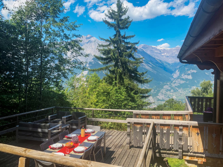 Beau chalet accueillant "Hermann", de 2 étages, année de construction 2006. Dans le quartier de Fragnière. A usage privé: jardin entretenu (pas clôturé) avec pelouse. Infrastructures de la Maison: local pour les skis, lave-linge, sèche-linge. En hiver, merci de prévoir des chaînes. Place de parking (pour 3 voitures), garage individuel. Magasins 1 km, piscine 800 m. Terrain de golf 18 km, tennis 700 m, télécabine 2 km. Arrêt du ski-bus 600 m. "Hermann", chalet 5 pièces 200 m2 sur 2 niveaux. Aménagement confortable et de bon goût: entrée. Grand séjour/salle à manger avec cheminée, TV (câblée) et DVD. Bagagerie. 1 chambre avec 2 lits (2 x 90 cm, longueur 200 cm), douche/bidet/WC. Cuisine ouverte (four, lave-vaisselle, 4 plaques à induction, four micro-ondes, cafetière électrique, Capsules pour machine à café (nespresso) (NON INCLUSES), appareil à raclette, service à fondue (fondue chinoise, fondue au fromage)). WC séparé. À l'étage supérieur: 1 chambre avec 2 lits (90 cm, longueur 200 cm), bidet et douche. Sortie sur le balcon. 1 chambre avec 1 grand-lit (160 cm, longueur 200 cm), salle de bains, bidet et double vasque. Sortie sur le balcon. 1 chambre d'enfants avec 1 lit gigogne (2 pers. 2 x 90 cm, longueur 190 cm). Sortie sur le balcon. WC séparé. 2 balcons, situation nord, terrasse, situation sud et situation ouest. Meubles de terrasse, chaises longues (2). Très belle vue panoramique sur les montagnes et la vallée. A disposition: lave-linge. Internet (Connexion WIFI, gratuit). Veuillez noter: maison non-fumeur.