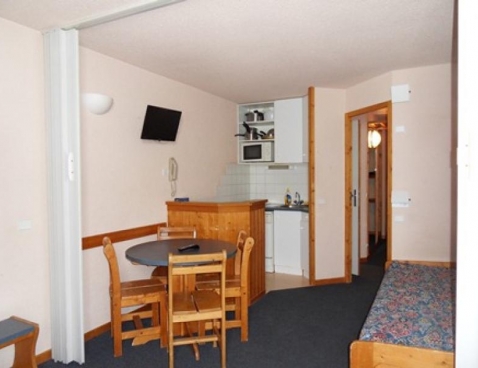 Studio 4 personnes situé au 1er étage de la résidence Etoile. Il dispose d'un séjour avec lits superposés, canapé BZ et d'un téléviseur écran plat. La cuisine est équipée d'un lave-vaisselle, mini-four grill, micro-ondes et d'un service à raclette.