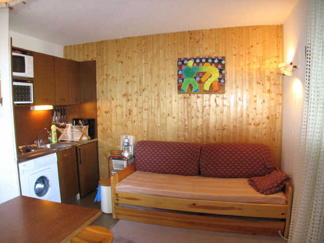 Studio cabine de 21 m² situé au 3ème étage avec ascenseur et balcon exposité nord, vue sur le Parc des Ecrins. Il y a 1 lit gigogne 2 personnes dans le séjour, 2 lits 1 place superposés dans la cabine.Toilettes dans la salle de bain. Le coin cuisine est équipé d'un réfrigérateur, de 3 plaques de cuisson électrique, d'une cafetière électrique, d'un four et d'un four à micro-ondes . Lave-linge. Prise télévision. Fer à repasser.