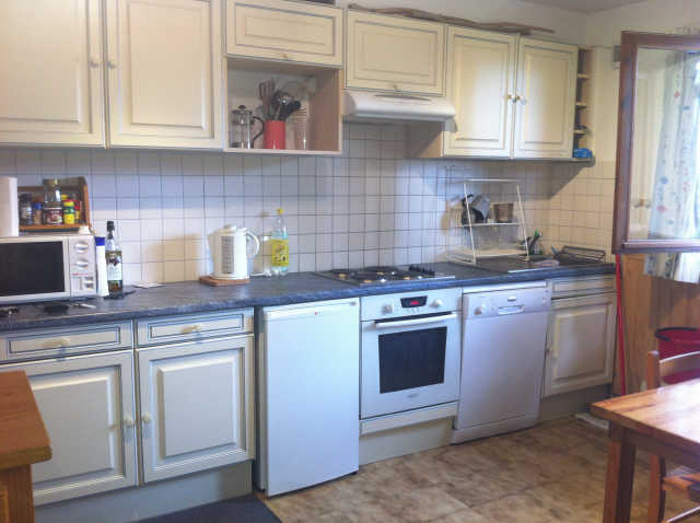 Cuisine équipée avec 2 plaques électriques, four micro ondes, réfrigérateur, lave vaisselle et lave linge