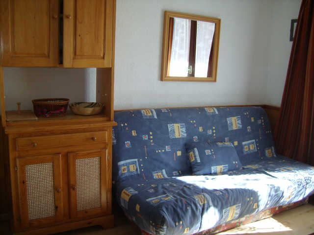 Studio coin nuit de 25 m² avec balcon exposé sud au 2ème étage en pied de piste, vue résidences. Il se compose d'une entrée avec 2 lits superposés, d'un séjour avec un canapé clic clac 2 places et télévision, une salle de bain avec baignoire et d'un wc indépendant. Le coin cuisine est équipé d'un réfrigérateur, de 2 plaques de cuisson électrique et d'un combiné micro-ondes-grill