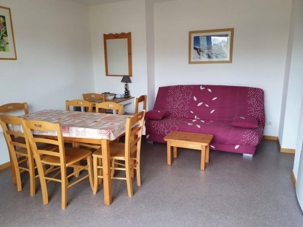 Séjour comprenant coin repas, un clic clac pour 2 personnes, coin montagne avec 2 lits superposés séparés du séjour par une petite cloison, TV,