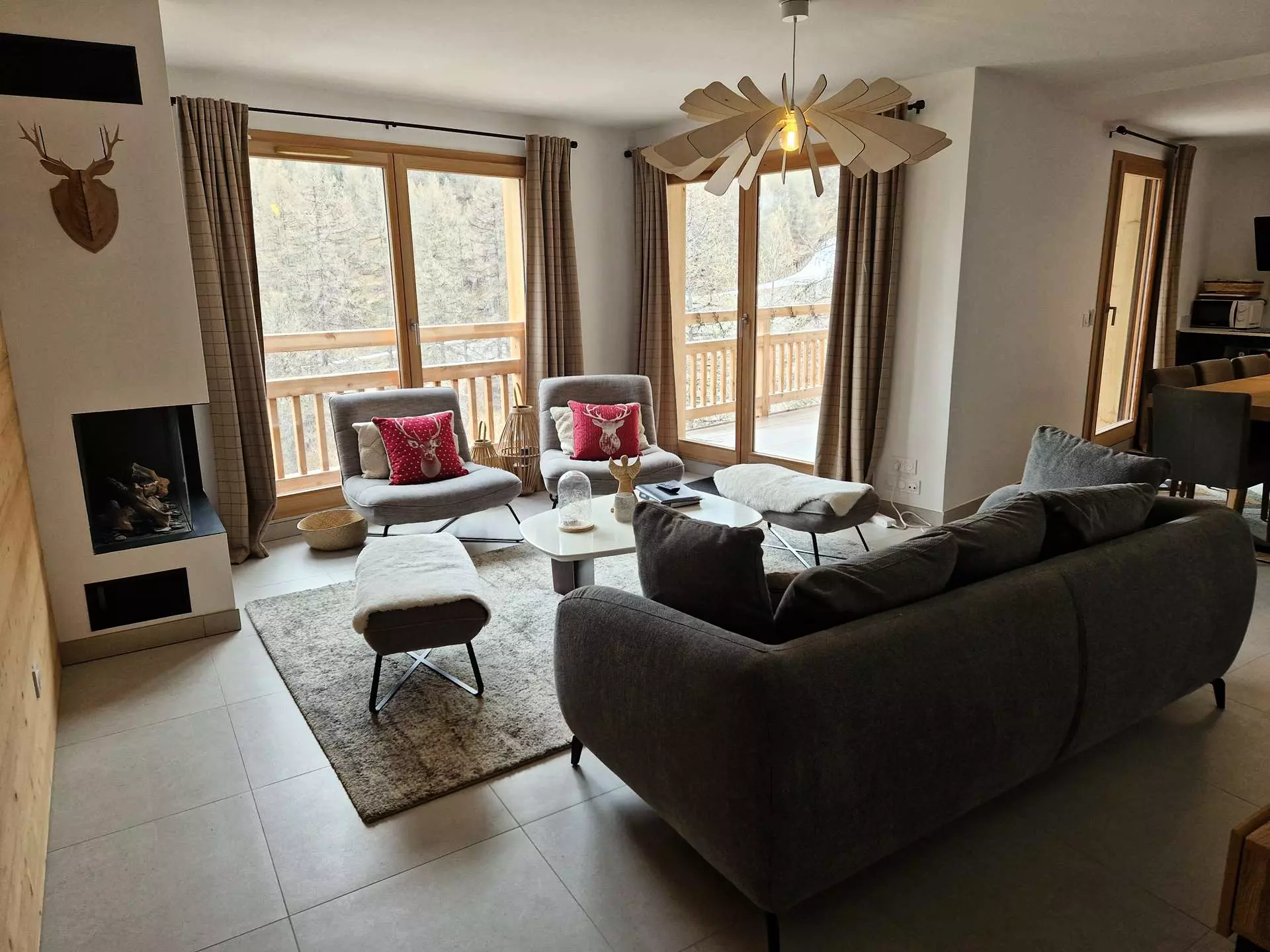 - un séjour ouvrant sur un grand balcon d'angle donnant d'un côté sur la vallée et de l'autre sur les chalets.