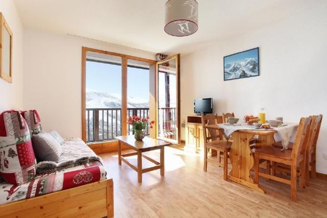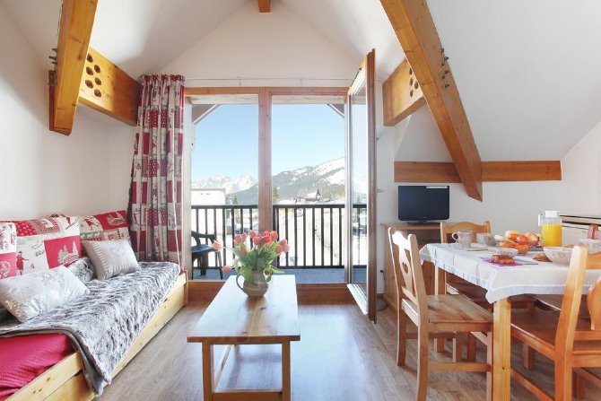 Résidence : Chalets traditionnels, avec façades à dominante en bois. Les logements bénéficie d'un balcon avec vue sur les massifs environnants, certains sont en duplex. Sur place à disposition : service boulangerie, casiers à skis et accès Wifi.