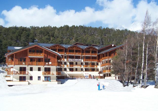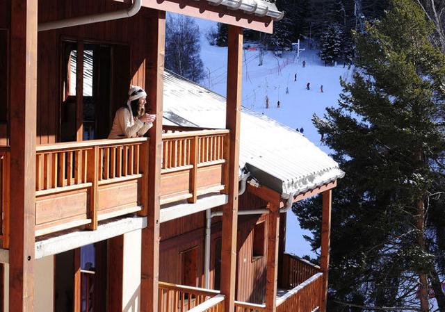 Résidence : 3 chalets de montagne avec façade en bois et ascenseurs. Les logements proposent tous un balcon avec chaises longues, certains disposant d'une vue sur les pistes.