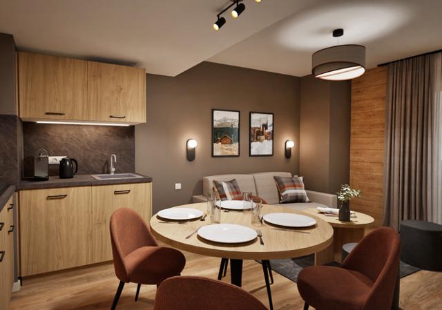 Résidence : Appartements mêlant matières naturelles, tons chaleureux et mobilier moderne. Piscine intérieure chauffée, espace bien être (en supplément) avec sauna, hammam et douches sensorielles. Restaurant avec petit déjeuner et magasin de ski.