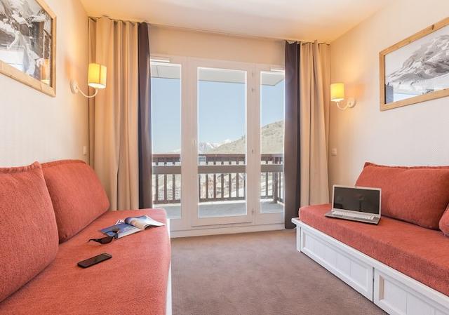 Appartements Skissim : Confortables et agréables, avec balcon et accessibles. Tout équipés au style savoyard. Sur place : piscine extérieure chauffée avec vue imprenable sur le massif du Thabor.