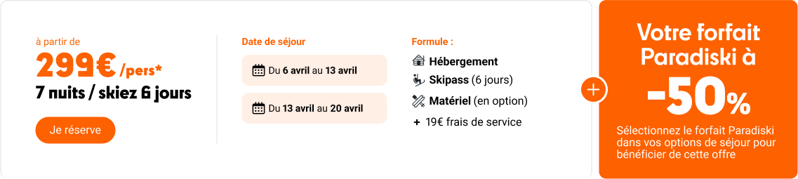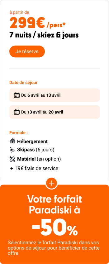 Températures douces, soleil radieux et grand ciel bleu : voilà le mix parfait pour vos vacances au ski. Profitez d'une offre exclusive sur une sélection de séjours du 6 au 20 avril et savourez les plaisirs de la glisse sans avoir à endurer le froid et les pistes bondées. Un séjour idéal qui ne présente que des avantages !
