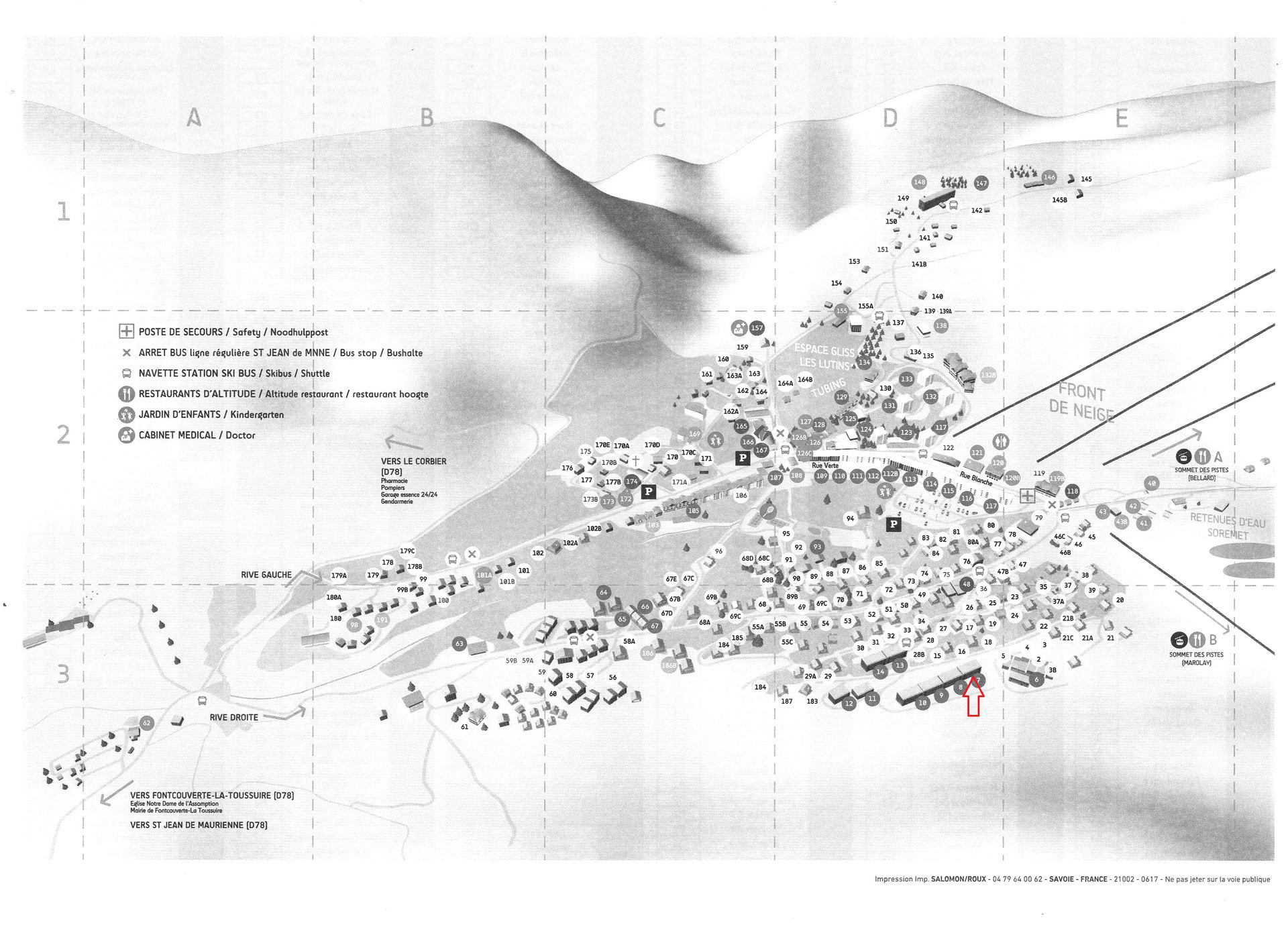 Commerces à 800 m. ESF à 500 m. Pistes à 200 m. Gare à 17 Km. La Résidence Eriscal située sur les hauteurs de la station, ensoleillée et calme disposant d'une vue panoramique inégalable sur la station, les pistes et les massifs montagneux. Départ et arrivée possible à ski. L'hiver navette bus gratuite. N° 7 sur plan station.