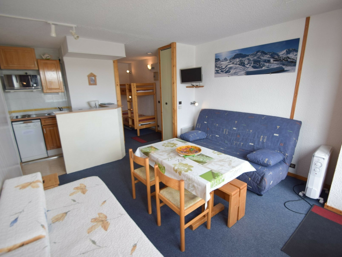 Studio cabine 3/4pers, 24m2, exposé Nord de plain pied, vue sur la montagne et vallée. Entrée droite 13 à 47 - Cuisine américaine : 2 plaques électriques, réfrigérateur, four micro-ondes grill, lave-vaisselle - SEJOUR : coin repas, 1 canapé-lit clic-clac 2p (130cm), TV - CABINE dans l'entrée ouverte sur séjour : 2 lits superposés (70cm x180)- SDB : baignoire WC séparés. Literie : couvertures - Les sols : moquette,sauf cuisine /SDB/WC: carrelage. Ménage de fin de séjour, draps, serviettes et forfaits ski en option - Casier à skis : N°14 au RDC - Studio très agréable, avec belle vue sur la vallée, porte fenêtre pour accès de plain-pied devant l'appartement.