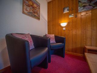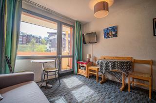L'appartement/ Meublé de Toursime 2* -Séjour avec 2 banquettes lit . La télévision. Terrasse. Chambre avec 2 lits simples. Cuisine séparée équipée de plaques électriques, lave vaisselle, four. Salle de bains avec baignoire, wc séparés. Casier à skis dans la résidence.