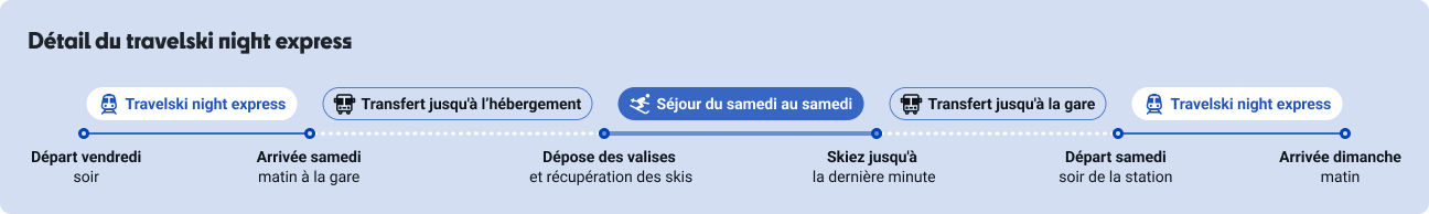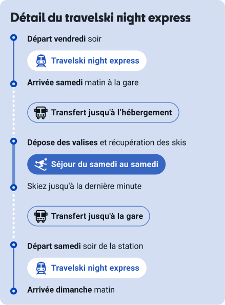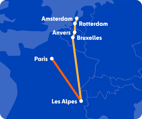 Réservez ici votre billet de train pour vos vacances au ski : aller-retour ou aller simple. Départ le vendredi soir depuis Paris Gare de Lyon, Bruxelles ou Anvers et arrivée au pied des pistes le samedi matin en Tarentaise (Moutiers, Aime, Bourg-Saint-Maurice). Grâce au voyage de nuit, vous profitez de 2 jours de ski en plus — soit jusqu’à 8 jours de glisse au lieu de 6.