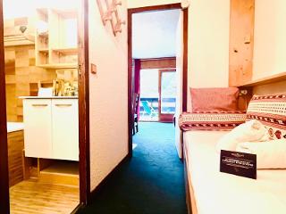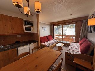 Studio avec un canapé double (140x190). Cuisine ouverte sur le séjour équipée de plaques électriques, four, micro-ondes, lave vaisselle, balcon avec jolie vue. Un coin montagne avec 2 lits superposés, salle de bain et wc séparé. Casier à ski et ascenseur dans la résidence. Appartement non fumeur.