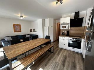 Apt 4 pièces 60 à 65 m2. Aménagement confortable: séjour/salle à manger avec 2 couchages et TV (satellite). 3 chambres, chaque chambre avec: 2 couchages. Cuisine (lave-vaisselle, 4 plaques vitrocéramique, combiné micro-ondes). Bain/WC. Chauffage. Balcon ou terrasse. A disposition: téléphone. Internet (Connexion WIFI). Place de parking (en sus, couvert) près de la maison. Maximum 1 animal/ chien autorisé. Merci de noter: couchages soit 3 chambres ou 2 chambre et 1 alcôve. 1 salle de douche et un WC supplémentaire dans la plupart des apts.