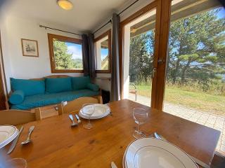 Kitchenette avec 2 plaques vitro céramiques, four micro-grill, réfrigérateur et lave-vaisselle. Séjour avec coin repas, 2 lits simples. Séparé du coin montagne (2 lits superposés de 2 personnes) par une cloison bois, TV comprise. Salle d'eau avec douche, lavabo et WC.