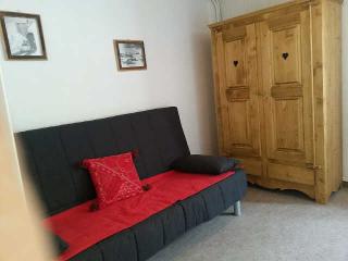 Studio 18 m2 au 2ème étage. Bien convenant à 2 adultes. Aménagement simple et fonctionnel: séjour/salle à manger avec 1 lit gigogne (2 pers. 2 x 80 cm). Coin cuisine (2 plaques vitrocéramique, four micro-ondes). Salle de bains, WC séparé. Situation sud. Vue sur les montagnes. Veuillez noter: logement pour non fumeurs.