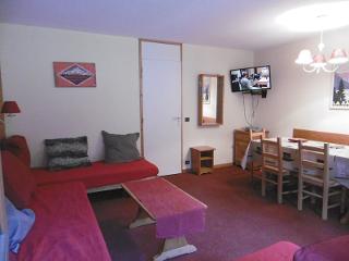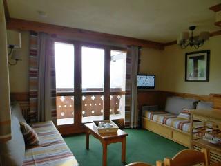 L'appartement: Séjour avec 2 banquettes lit . Terrasse. Chambre avec 2 lits simples. Cuisine séparée équipée de plaques electriques, lave vaisselle, four. Salle de bains avec baignoire, wc séparés. Casier à skis dans la résidence. Non fumeur souhaité.