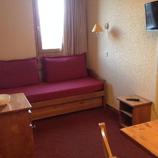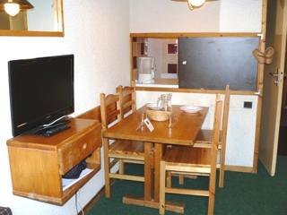 Classement Meublé Tourisme 1* - L'appartement :Séjour avec un canapé et la télévision. Mezzanine avec un lit double en 160. Chambre avec un ensemble de lits superposés. Cuisine équipée de plaques électriques, lave vaisselle, four multifonctions et réfrigérateur. Salle de douche avec wc. Balcon. Casier à skis dans la résidence.